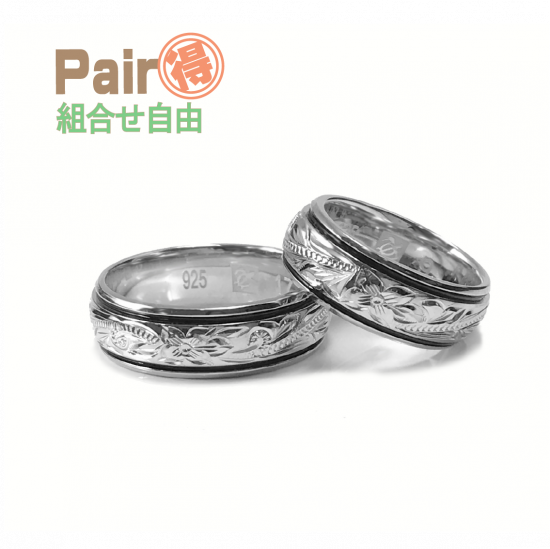 定番のプルメリアとスクロール柄が黒いラインに映えて、クールな印象が人気のエナメルラインシリーズです。5〜23号まで揃っているので、大切な人とのペアリングにもピンキーリングにもオススメです。