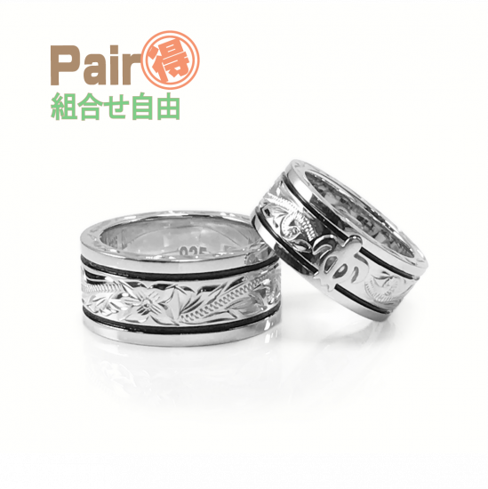 写真右は、hooホヌ(亀)を写真左は、プルメリア彫りをほどこすことで、愛らしさも漂わせた伝説の逸品です。エッジの部分にも丹念にスクロールの彫りを入れることで、お洒落へのこだわりを引き立たせています。hooホヌが奏でるラブストーリーが、あなたと大切な方との永遠の愛に寄り添います。大切な方とのペアリングやプレゼントにもぴったりです。プルメリア彫りのリングは、幅10mmと幅12mmがございます。